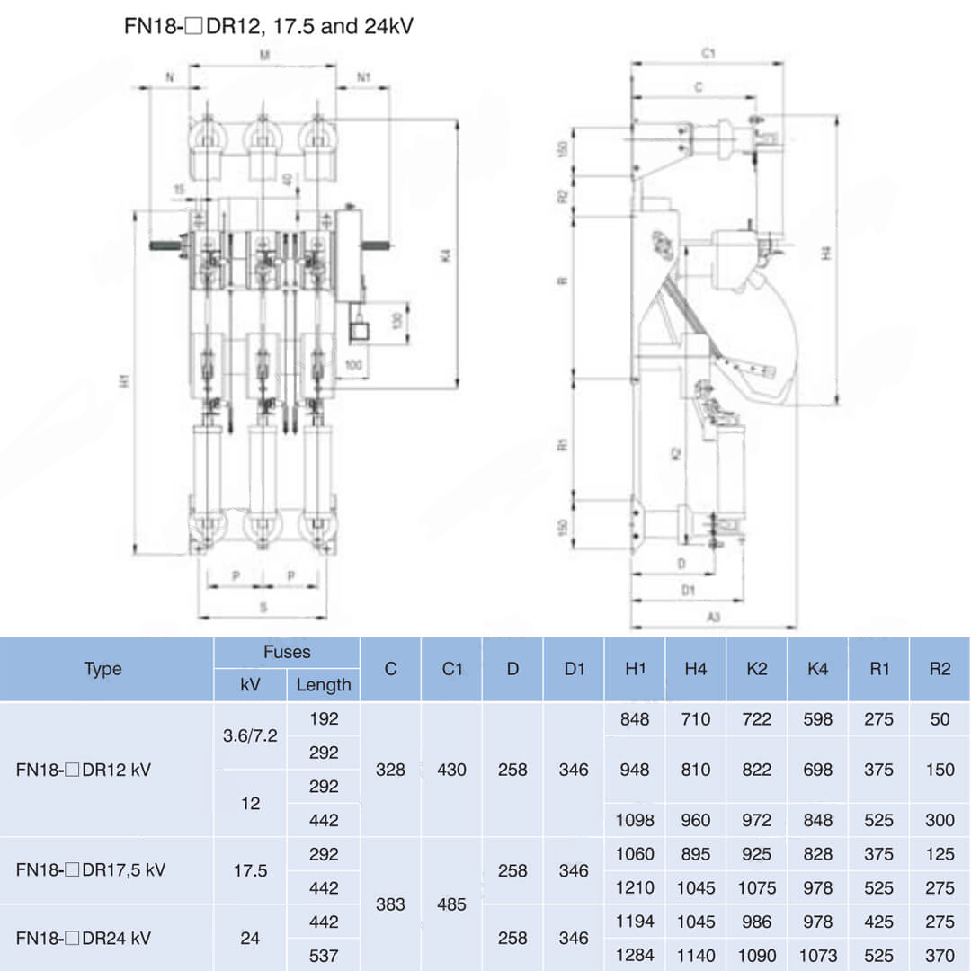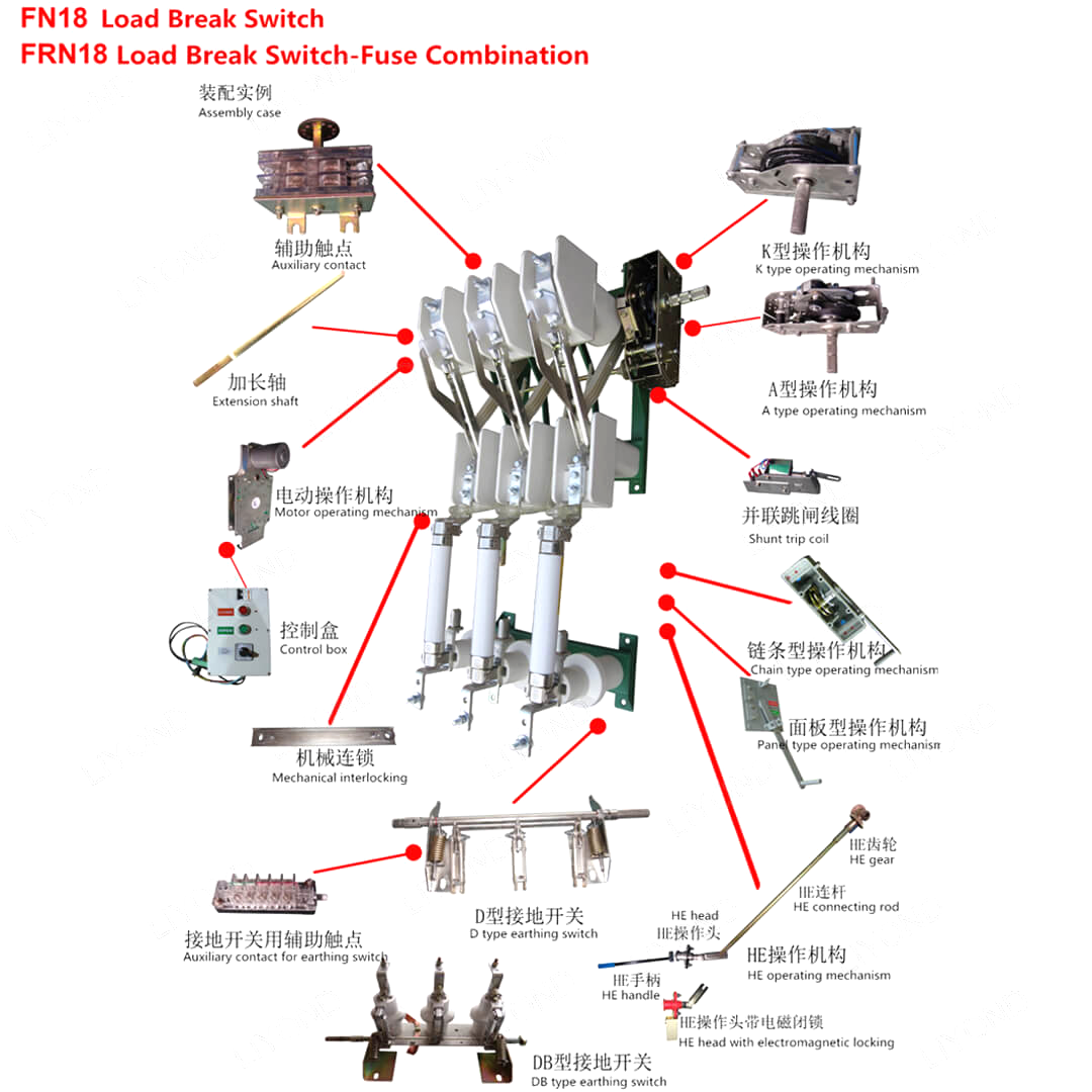 FN18-Lastschalter und Lastschalter-Sicherungs-Kombinationen sind Hochspannungs-Hochleistungslastschalter, die eine Druckluft-Lichtbogenlöschung und eine gaserzeugte Lichtbogenlöschung kombinieren. Die Kombination aus Lastschalter und Sicherung vereint die Vorteile des Lastschalters mit denen der Sicherung, um jeden Laststrom bis zum Nennausschaltstrom des Lastschalters zu schalten und jeden Überstrom bis zum Nennkurzschlussausschaltstrom der Kombination durch die Betätigung der Sicherung und ihres Impingers zu schalten.