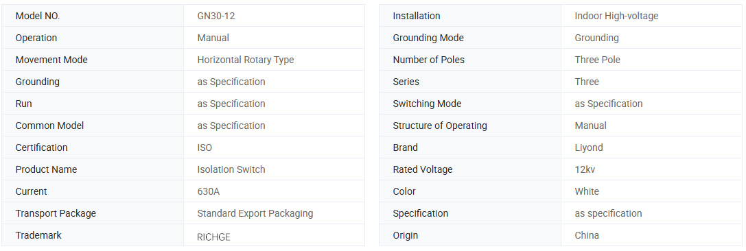 Der drehbare Hochspannungs-Trennschalter für den Innenbereich vom Typ GN30-12 ist ein neuartiger Trennschalter mit Drehkontaktmesser. Die Hauptstruktur besteht darin, dass die obere und untere Ebene des gemeinsamen Dreiphasen-Chassis mit zwei Sätzen von Isolatoren und Kontakten befestigt sind und der Schalter durch Drehen des Kontaktmessers geöffnet und geschlossen wird.