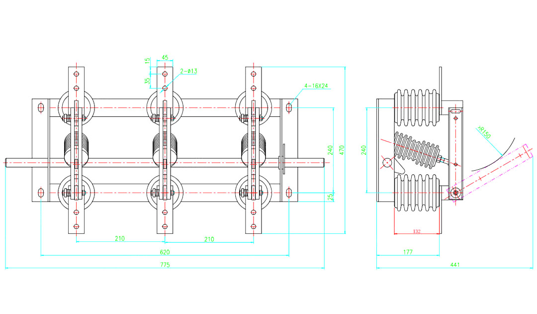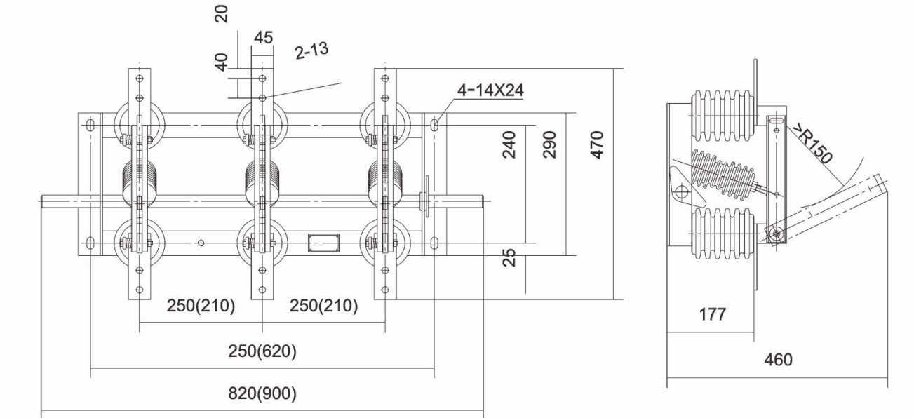 Der leitende Teil des GN19-12/400, 630, 1000, 1250 Typ-Trennschalters wird von zwei Säulenisulatoren für jede Phase auf der Basis fixiert. (GN19-12C/400, 630, 1000, 1250 Typ hat einen Säulenisolator und einen Porzellanhülle-Isolator.) Die drei Phasen sind parallel installiert, und das leitende Teil besteht aus statischen Kontakten von Kontaktmesser und Kontakthaltern (oder leitenden Stangen). Jede Phase des Kontaktmessers ist mit der Mitte des Krawattenisolators, dem Krawattenisolator angeschlossen und auf der Basis der angeschlossenen Spindel installiert. Die Spindel ist mit dem Anschlussstab (benutzerbereitete) und CS6-1-Mechanismus durch den Griff verbunden. Das Verbindungskontaktmesser besteht aus zwei geschlitzten Kupferplatten, die nicht nur die Wärmeableitungsfläche des Kontaktmessers auf die untere Temperatur absenken, sondern auch die mechanische Festigkeit des Kontaktmessers verbessert, so dass die dynamische Stabilität des Schalters verbessert wird. Ein Ende des Kontaktmessers wird am Kontaktblock (oder auf der leitenden Stange) durch einen Bolzen (Auto des Shaws) montiert. GN19-12/1000, 1250 In Kontakt mit der Installation der Magnetverriegelungsplatte sowie dem Zweck der Magnetverriegelungsplatte besteht darin, dass ein großer Kurzschlussstrom zur Verbesserung des Zweirille-Kontaktmessers zwischen den | Attraktion. GN19-12/400, 630 Unterbrechungsschalter haben eine kleine Grenze durch Strom, sodass keine Magnetverriegelungsplatte hinzugefügt werden muss.