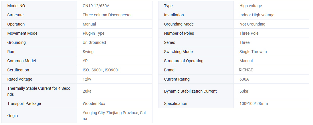 Der Innen-AC-Hochspannungs-Trennschalter der Serie GN19-12(c) eignet sich für AC 50 Hz, Nennarbeitsspannung von 12 kV, 10 kV, Nennarbeitsstrom von 400 A, 630 A, 1250 A, als Spannung und keine Last unter der Bedingung einer Unterbrechung, Innenschaltanlage mit geschlossenem Stromkreis. Nennspannung 12 kV und darunter, ausgestattet mit einem manuellen Betätigungsmechanismus, zum Schalten von Elektrogeräten unter der Bedingung von Spannung, aber nicht Ladung, Es werden auch Antifouling-Typ-, Plateau-Typ- und Live-Anzeigegeräte hergestellt, die installiert werden können. Der Innen-Hochspannungs-Trennschalter der Serie GN19-12 ist ein Innengerät mit einer Nennspannung von 12 kV und dreiphasigem Wechselstrom 50 Hz.